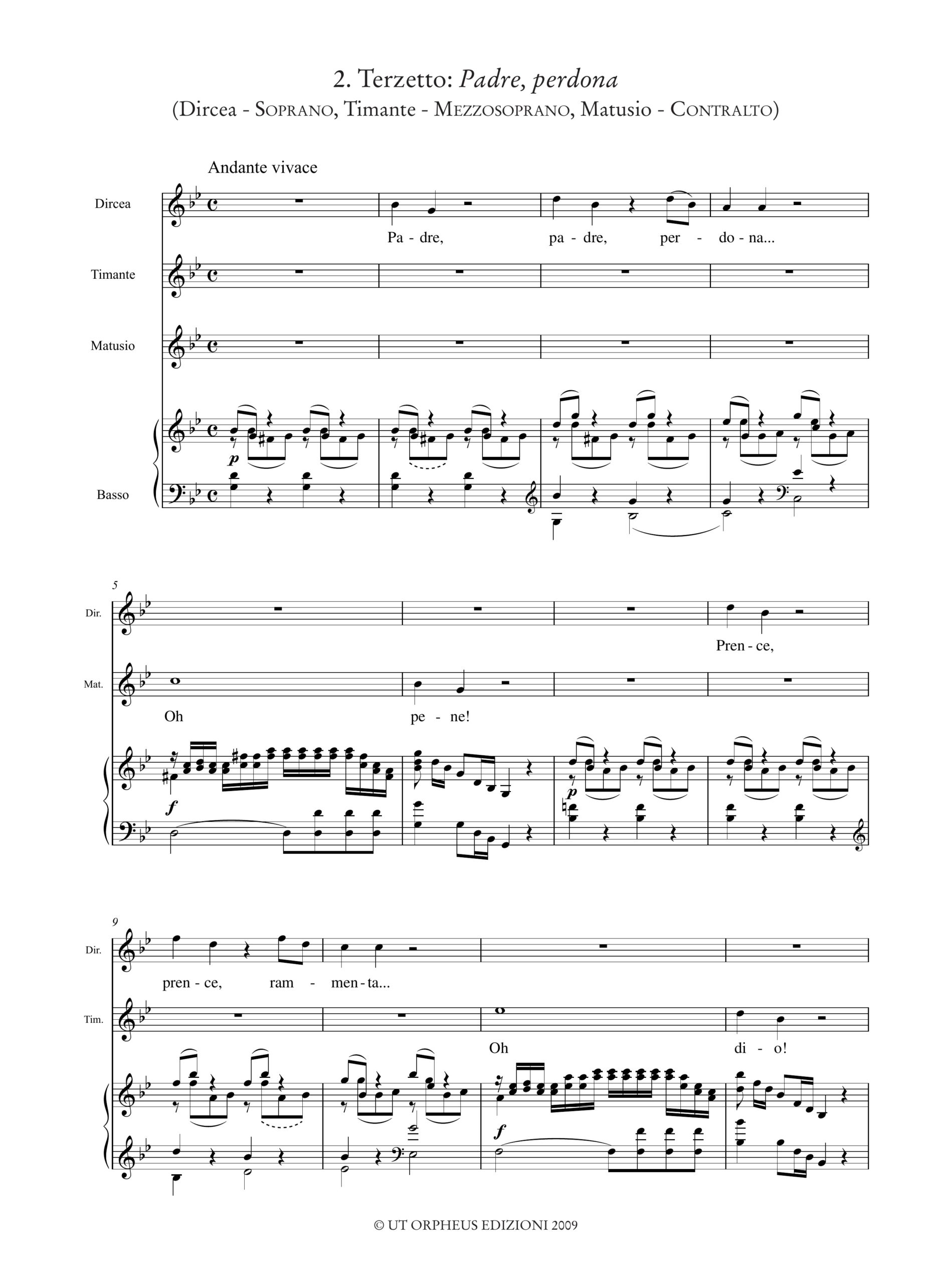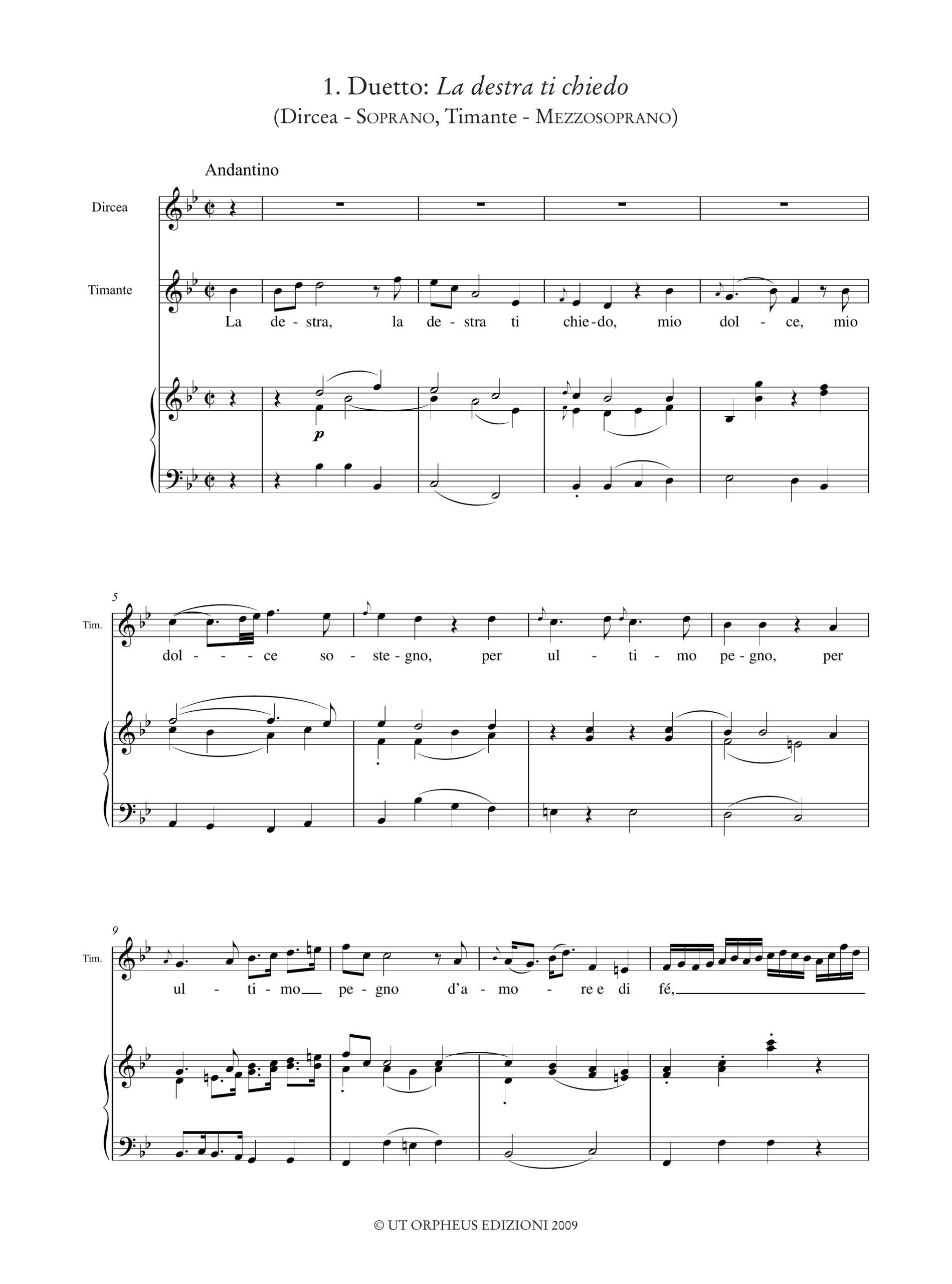 Contenuto e Descrizione: Duetto: La destra ti chiedo (Dircea – Soprano, Timante – Mezzosoprano); Terzetto: Padre, perdona (Dircea – Soprano, Timante – Mezzosoprano, Matusio – Contralto)