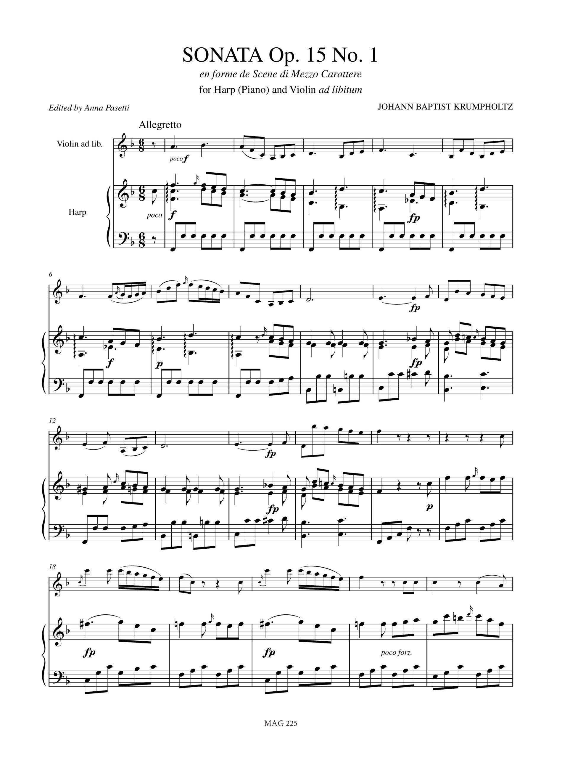 Krumpholtz, Johann Baptist: Sonata Op. 15 N. 1 per Arpa (Pianoforte) e Violino ad libitum