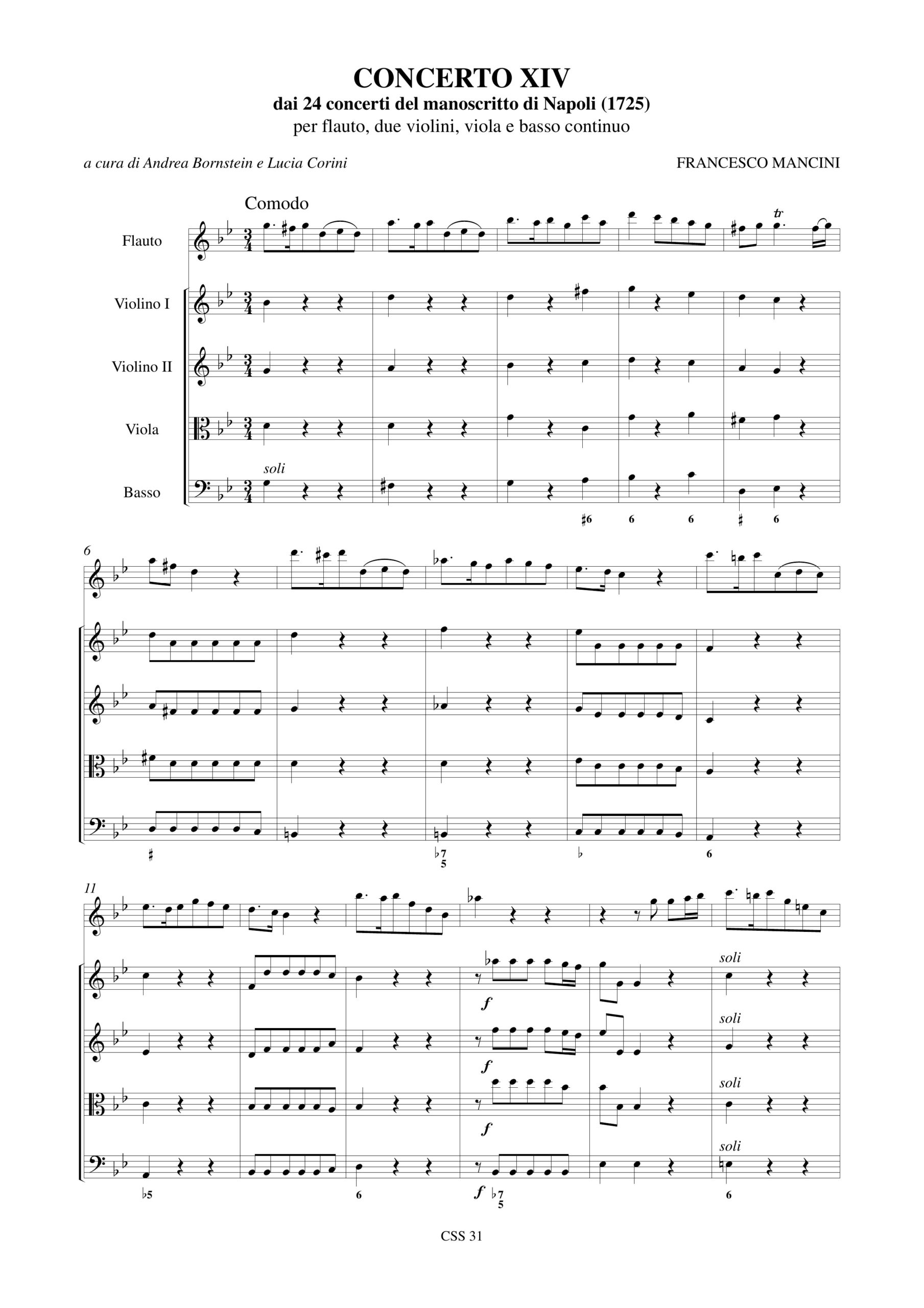 Mancini, Francesco: Concerto XIV dai 24 Concerti del manoscritto di Napoli (1725) per Flauto, 2 Violini, Viola e Basso Continuo