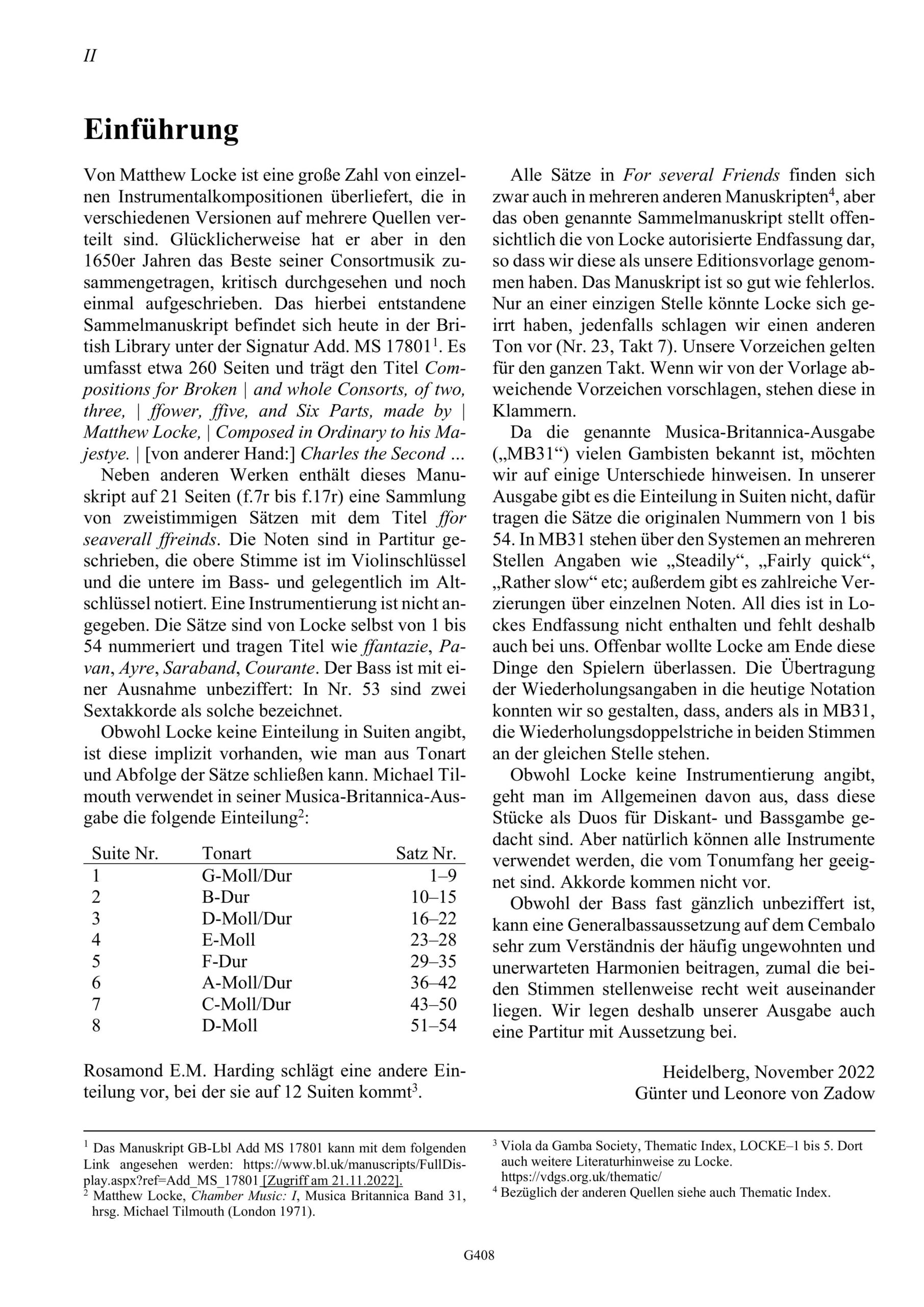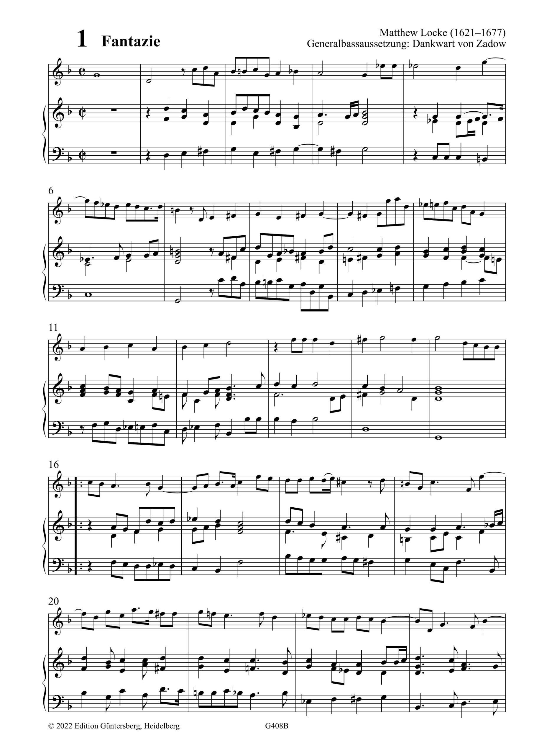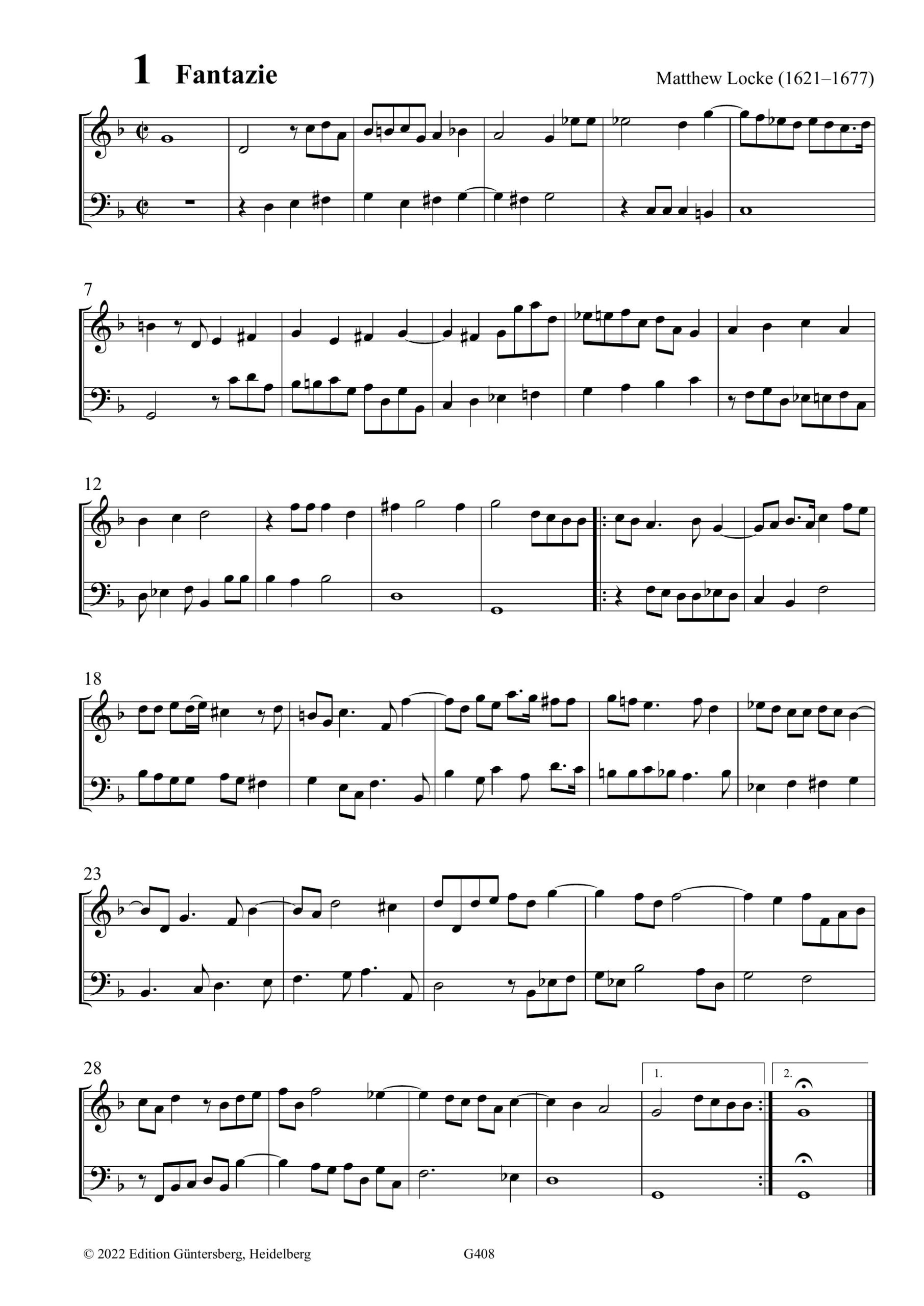 für ein hohes und ein tiefes Instrument. Sie ist in einem Sammelmanuskript mit Consortmusik überliefert, das auch Lockes bekannte Duos für zwei Bassgamben enthält. Deshalb liegt es nahe, die vorliegenden Stücke als Duos für Diskant- und Bassgambe zu verstehen. Aber natürlich können alle Instrumente verwendet werden, die vom Tonumfang her geeignet sind. Wir empfehlen auch eine Ausführung mit Generalbassinstrument. Die Sätze können aufgrund der Tonarten in Suiten eingeteilt werden. Sie sind von mittlerem Schwierigkeitsgrad mit manchen ungewohnten und unerwarteten Harmonien, wie wir es von Locke aus anderen Kompositionen kennen. Diese Musik entfaltet ihre Wirkung umso besser je häufiger man sie spielt. Unsere Ausgabe umfasst zwei Partituren und eine weitere mit Generalbassaussetzung.