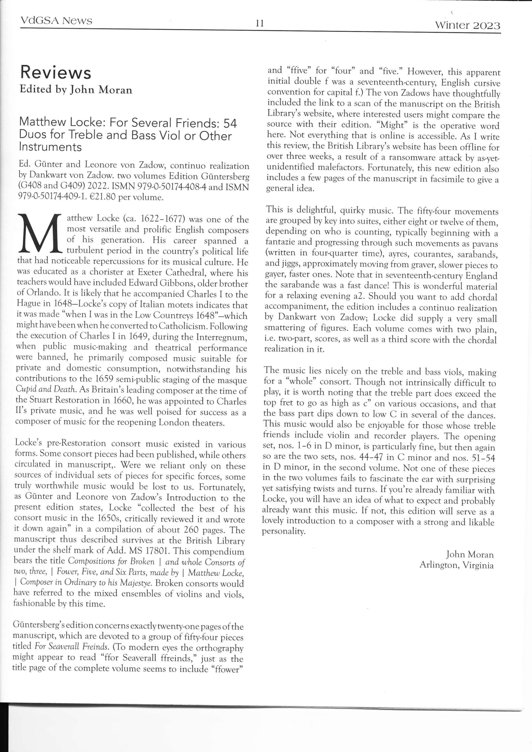 Matthew Locke, For several Friends, 54 Duos für Diskant- und Bassgambe oder andere Instrumente, Stücke Nr. 29–54, VdG-D+VdG, 3 Partituren, 1 davon mit Aussetzung, 84 S., ISMN 979-0-50174-409-1