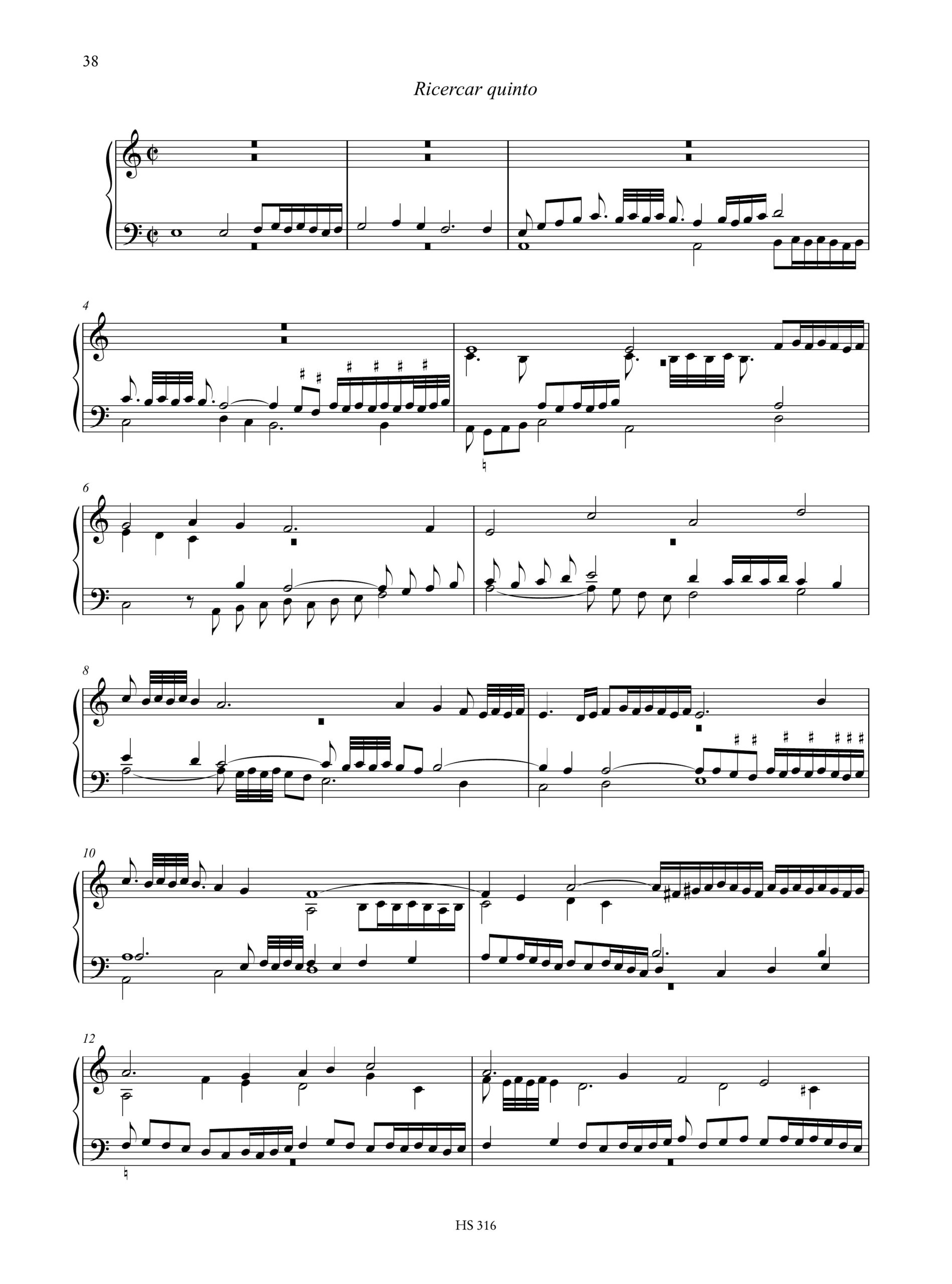 Non mi sono inoltre attenuto strettamente alle ‘regole’ di intavolatura indicate da Diruta ed esemplificate nelle numerose stampe del tempo, limitandomi a indicare la distribuzione delle parti tra le due mani in modo non rigoroso, sempre per evitare di inficiare una chiara lettura del movimento delle voci.