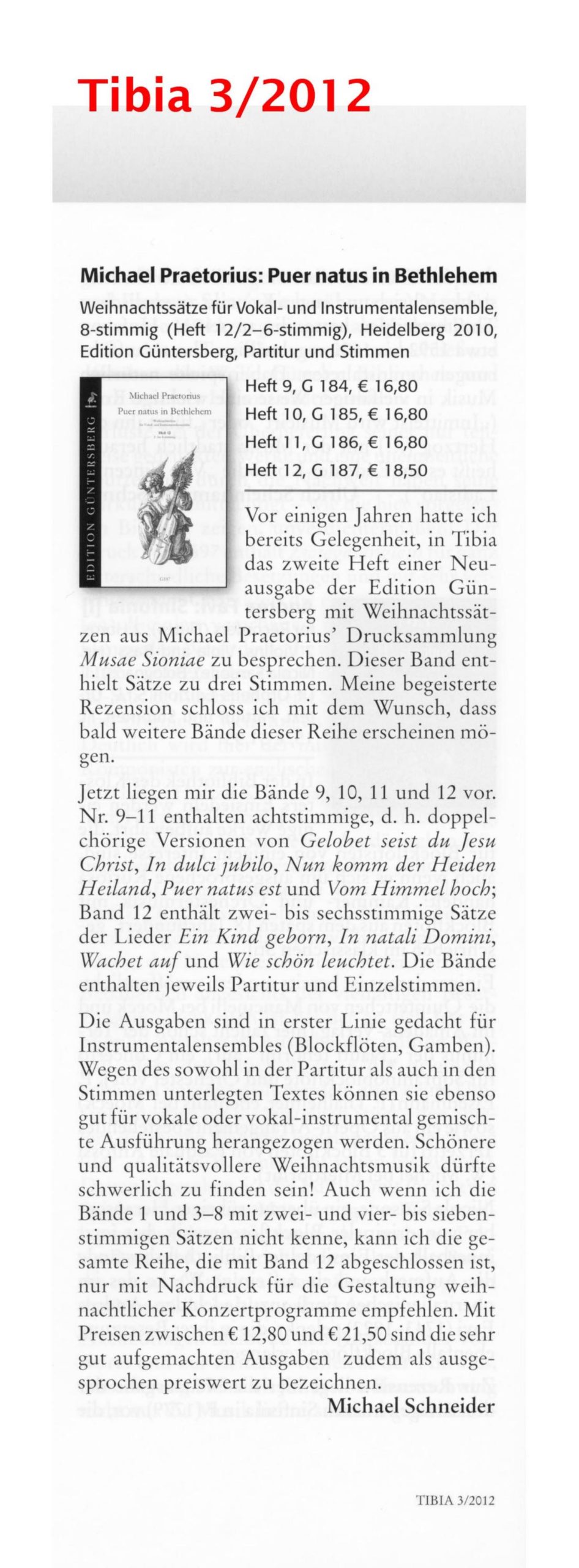 M. Praetorius, Puer natus, Weihnachtssätze, Heft 12 (2- bis 6-stimmig), 6Cons, Partitur und sechs Stimmen, 72 S., ISMN 979-0-50174-187-8