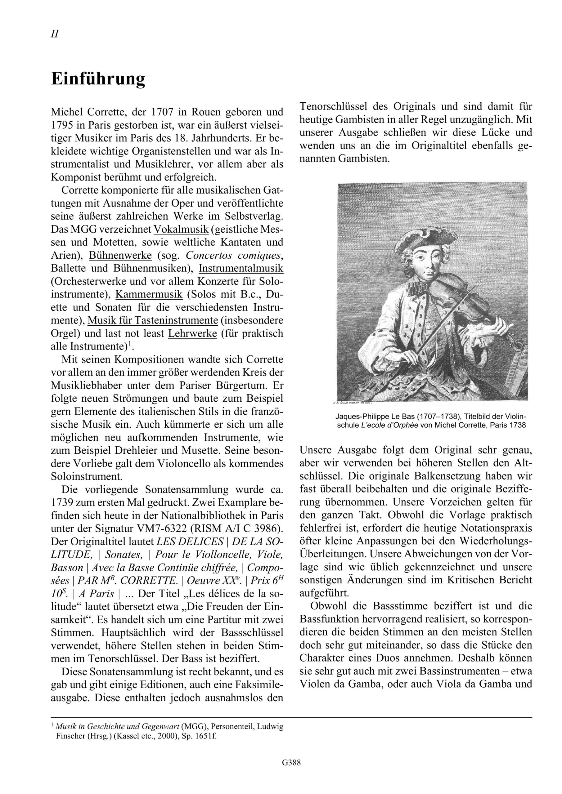 Michel Corrette war ein äußerst vielseitiger Musiker und Musikpädagoge im Paris des 18. Jahrhunderts. Seine hier vorgelegten Sonaten sind für Violoncello, Viola da Gamba oder Fagott in gleicher Weise geeignet. Obwohl die Continuostimme die Bassfunktion hervorragend realisiert, korrespondieren die beiden Stimmen doch sehr gut miteinander, so dass die Stücke den Charakter eines Duos annehmen und deshalb auch bestens mit zwei Bassinstrumenten gespielt werden können. In unserer Ausgabe verwenden wir im Gegensatz zum Originaldruck für hohe Stellen den Altschlüssel und tragen so den Bedürfnissen von Gambisten Rechnung. Corrette war mit einem heiteren, begeisterungsfähigen Wesen begabt, und diese Grundzüge zeigen sich auch in diesen Sonaten. Daher möchten wir sie allen spielfreudigen Musikanten sehr empfehlen.