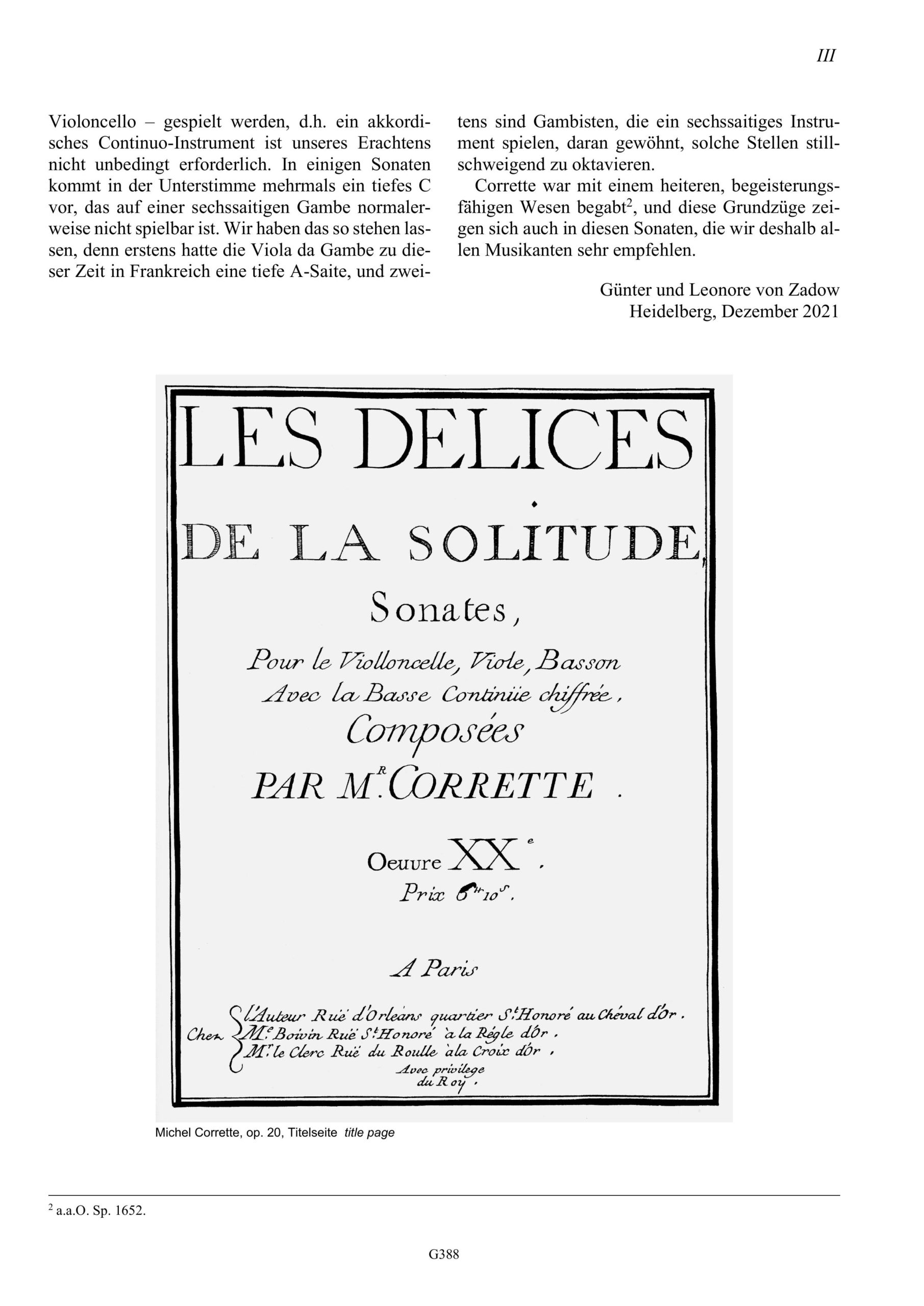 Michel Corrette, Les délices de la solitude, Op. 20, Sonaten I-III, VdG+Bc/2VdG, Partitur und zwei Stimmen, 44 S., ISMN 979-0-50174-388-9