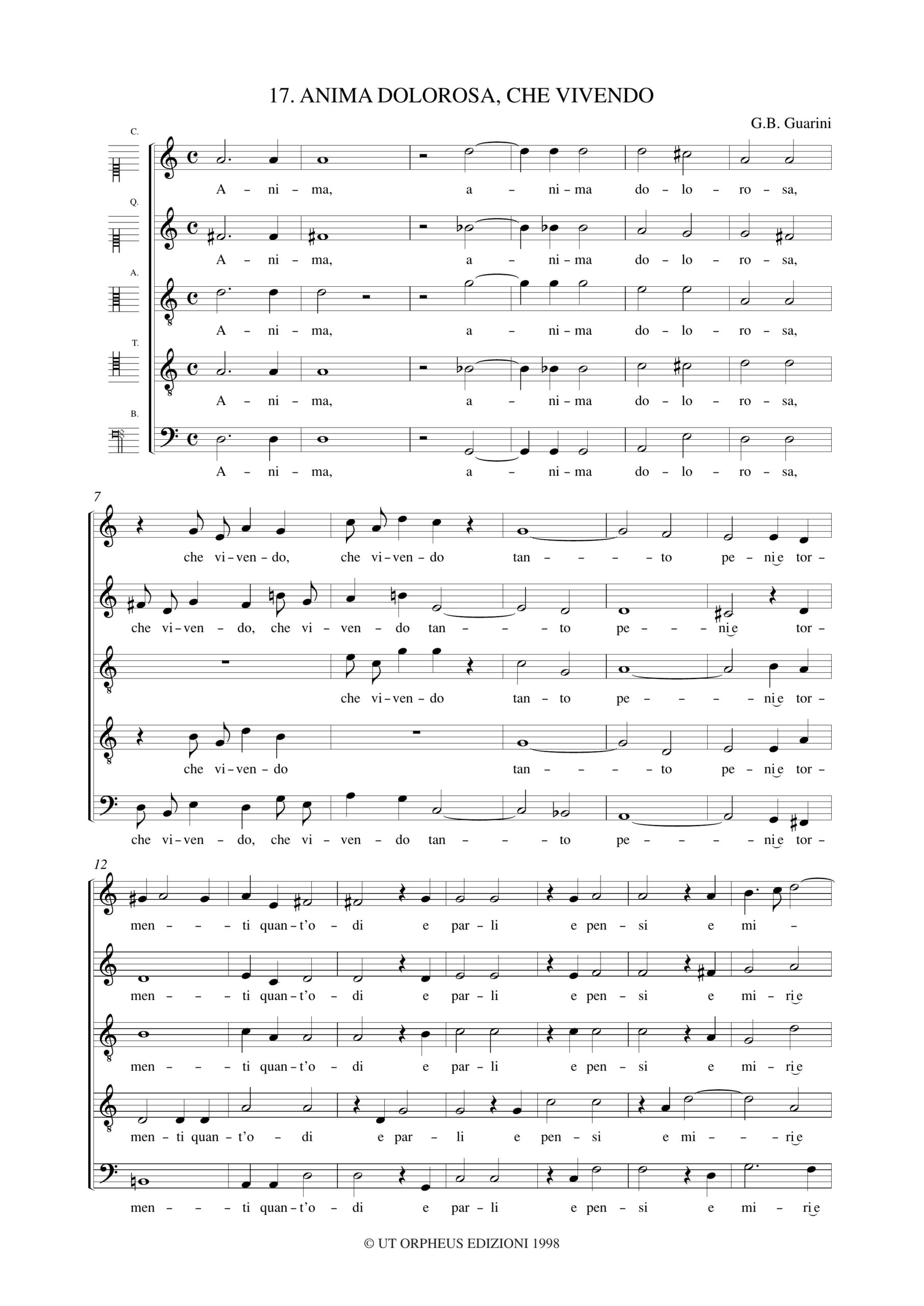 Monteverdi, Claudio: Anima dolorosa, che vivendo (Madrigali. Libro IV, n. 17) a 5 voci (SSATB) [Partitura Coro]