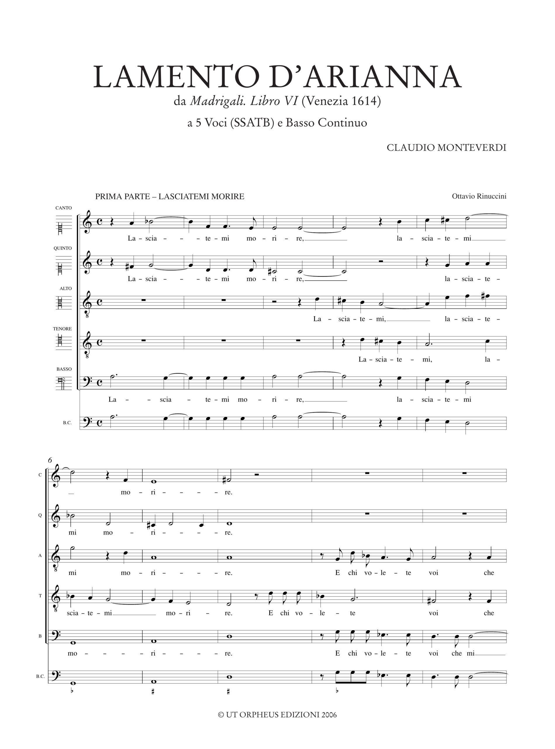 Monteverdi, Claudio: Lamento d’Arianna (Madrigali. Libro VI, n. 1) a 5 Voci (SSATB) e Basso Continuo [Set Parti]
