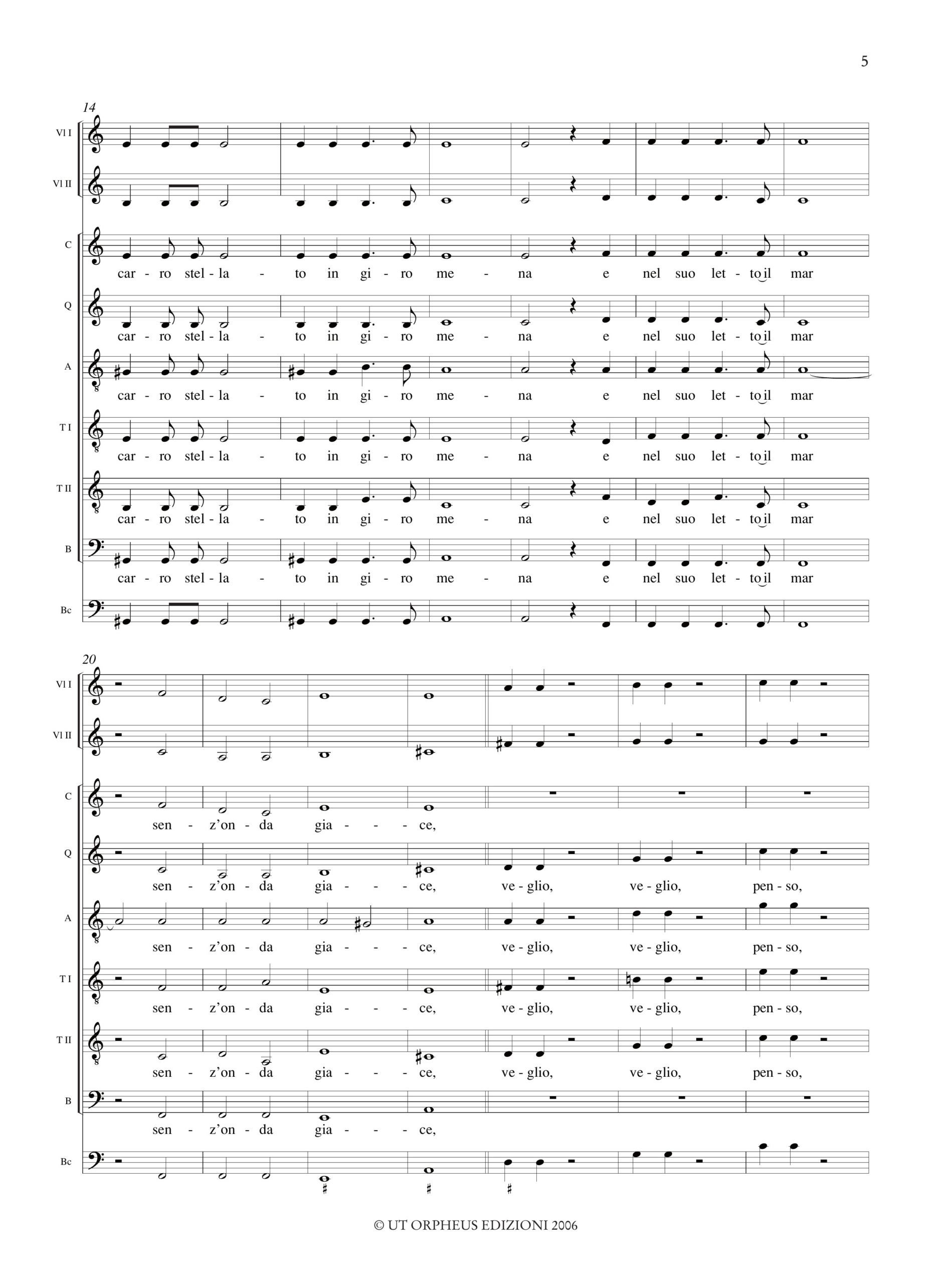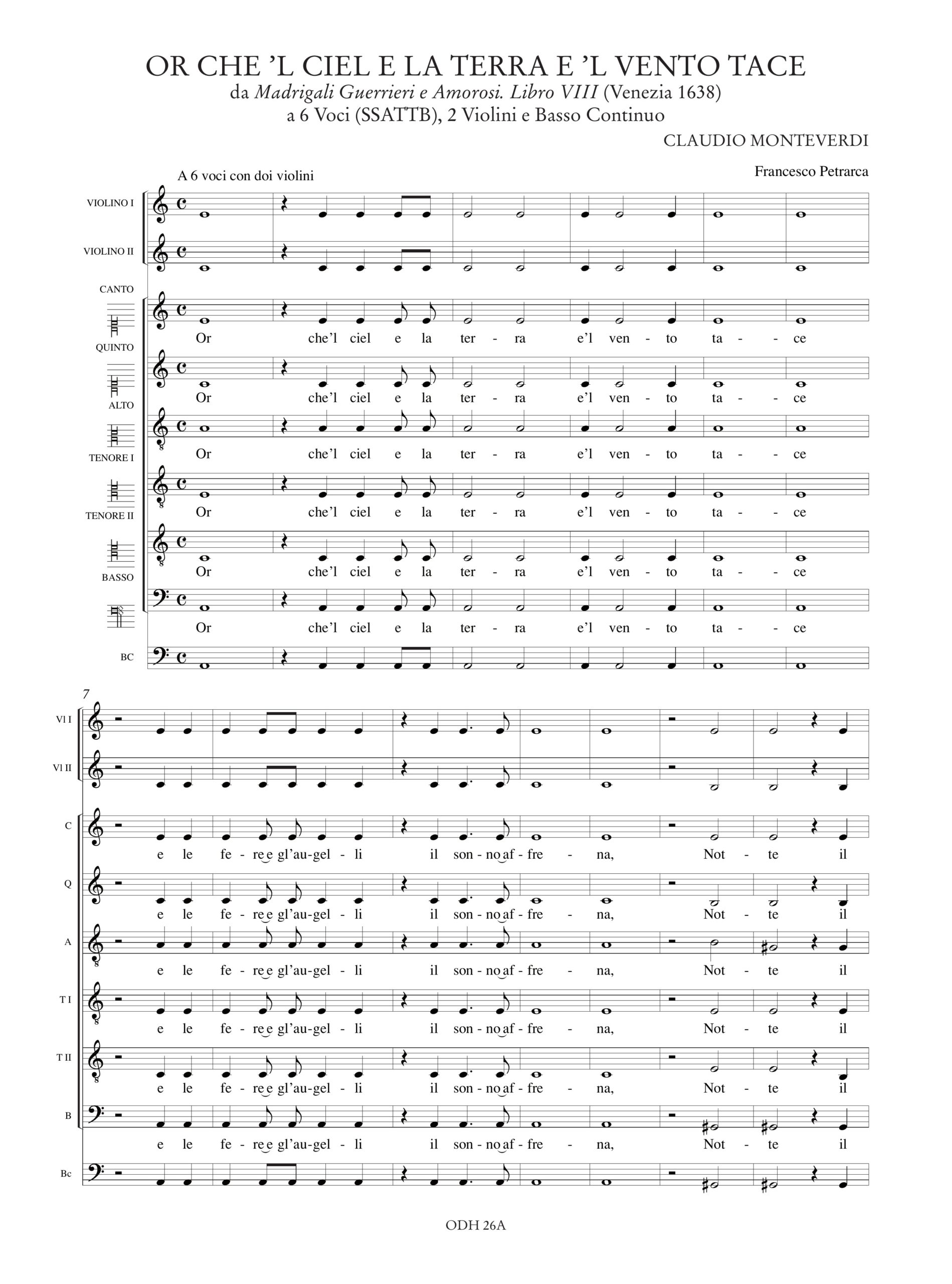 Monteverdi, Claudio: Or che ’l ciel e la terra e ’l vento tace (Madrigali Guerrieri. Libro VIII, n. 2) a 6 Voci (SSATTB), 2 Violini e Basso Continuo