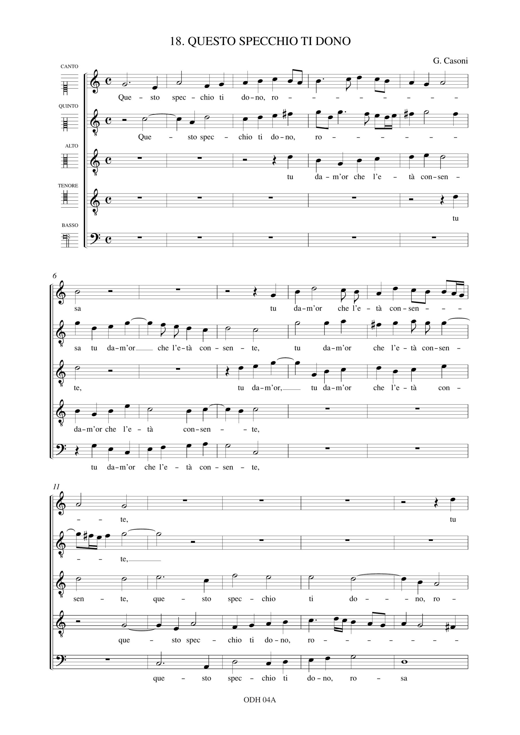Monteverdi, Claudio: Questo specchio ti dono (Madrigali. Libro II, n. 18) a 5 voci (SAATB) [Partitura Coro]