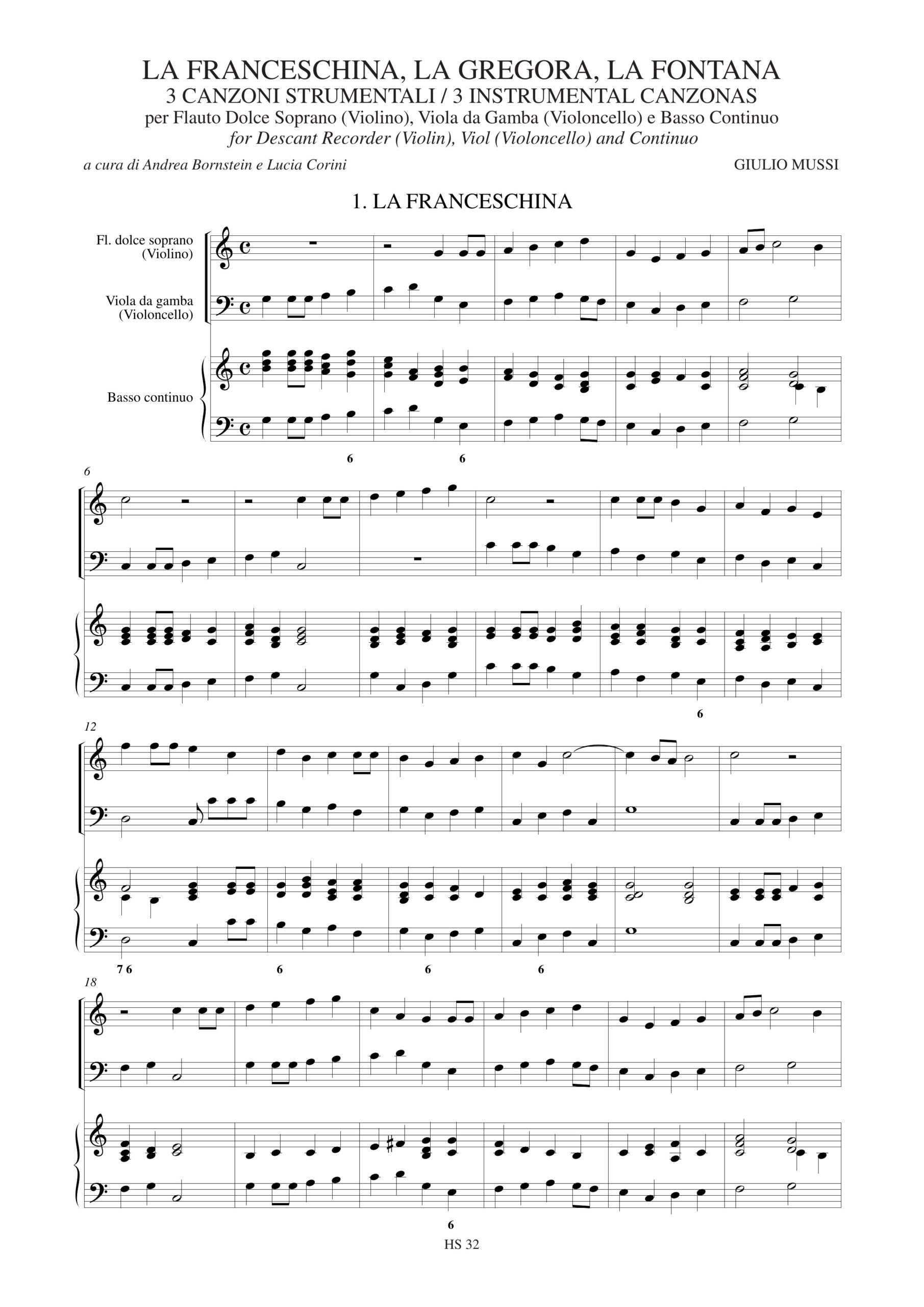 Mussi, Giulio: La Franceschina, La Gregora, La Fontana. 3 Canzoni Strumentali (Venezia 1620) per Flauto Dolce Soprano (Violino), Viola da Gamba (Violoncello) e Basso Continuo