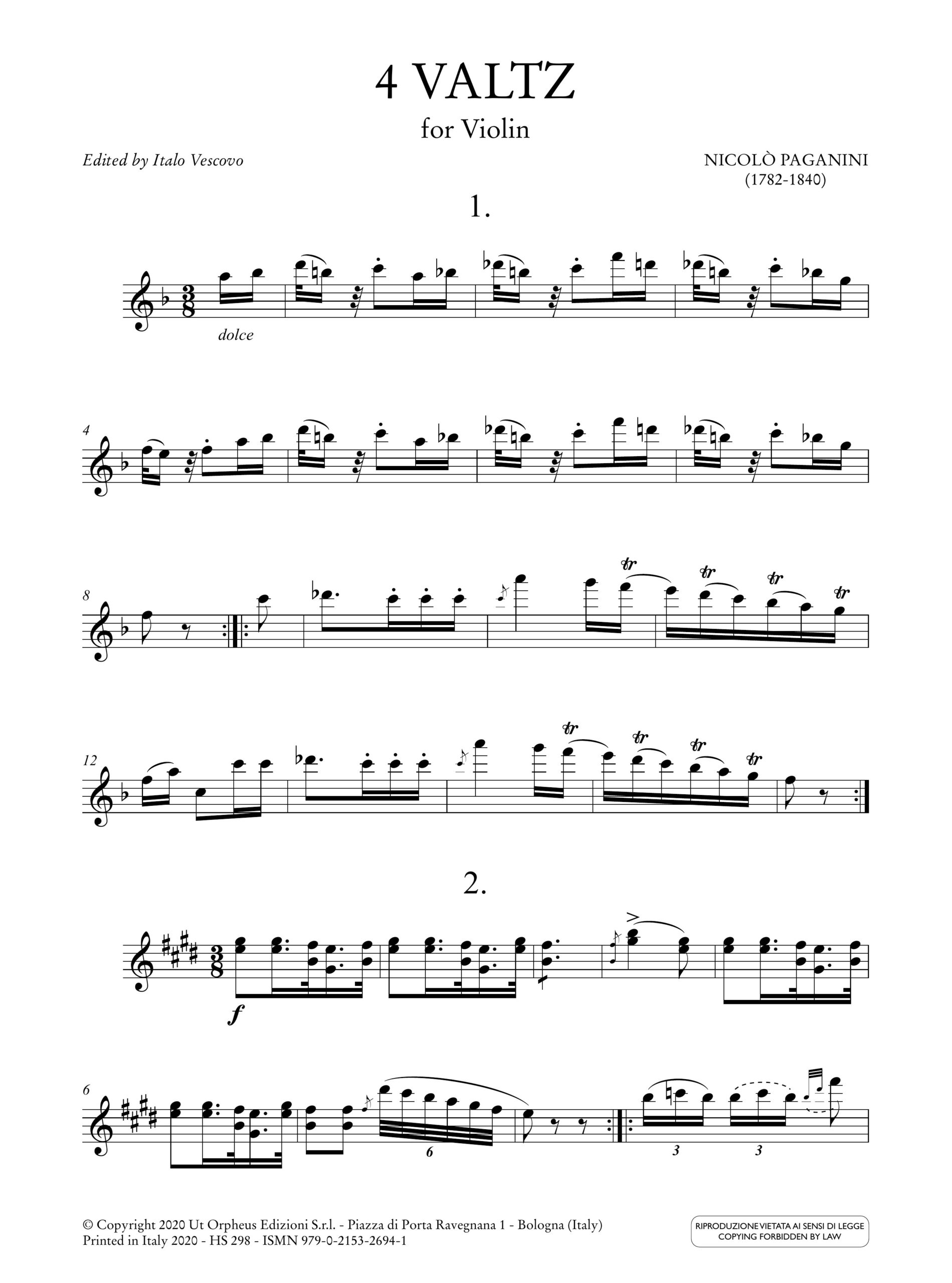 Contenuto e Descrizione: I quattro Valtz (più un quinto in Appendice, che costituisce la prima stesura del n. 3) per violino, qui pubblicati per la prima volta nella loro veste autografa, costituiscono, pur nella loro brevità, una preziosità musicale che si aggiunge al ricco e variegato catalogo paganiniano delle opere per violino solo. I brani si trovano all’interno dell’autografo dei