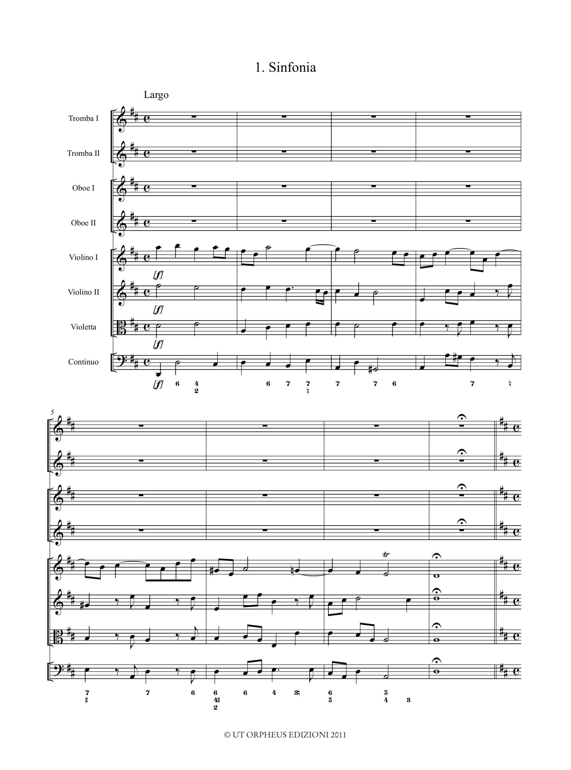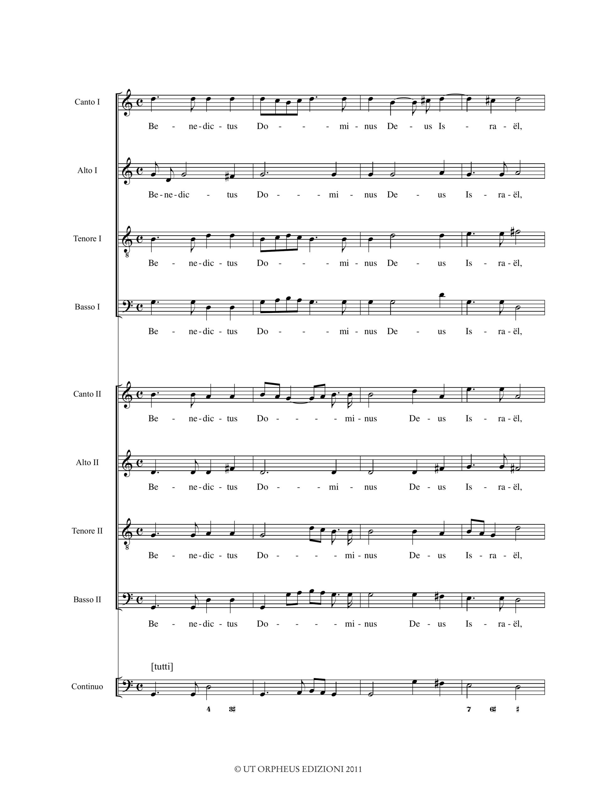 Contenuto e Descrizione: Cessate, mortis funera. Mottetto a 5 voci (SSATB) con Trombe, Oboi, Cornetti, Archi e Basso Continuo; Benedictus. Cantico a 8 voci (SATB-SATB) con Basso Continuo; Benedictus. Cantico a 5 voci (SSATB) con Archi e Basso Continuo; Canite, cives. Mottetto a 5 voci (SSATB) con Trombe, Cornetto, Archi e Basso Continuo; Alleluia. Mottetto a 8 voci (SATB-SATB) con Oboe, Archi e Basso Continuo