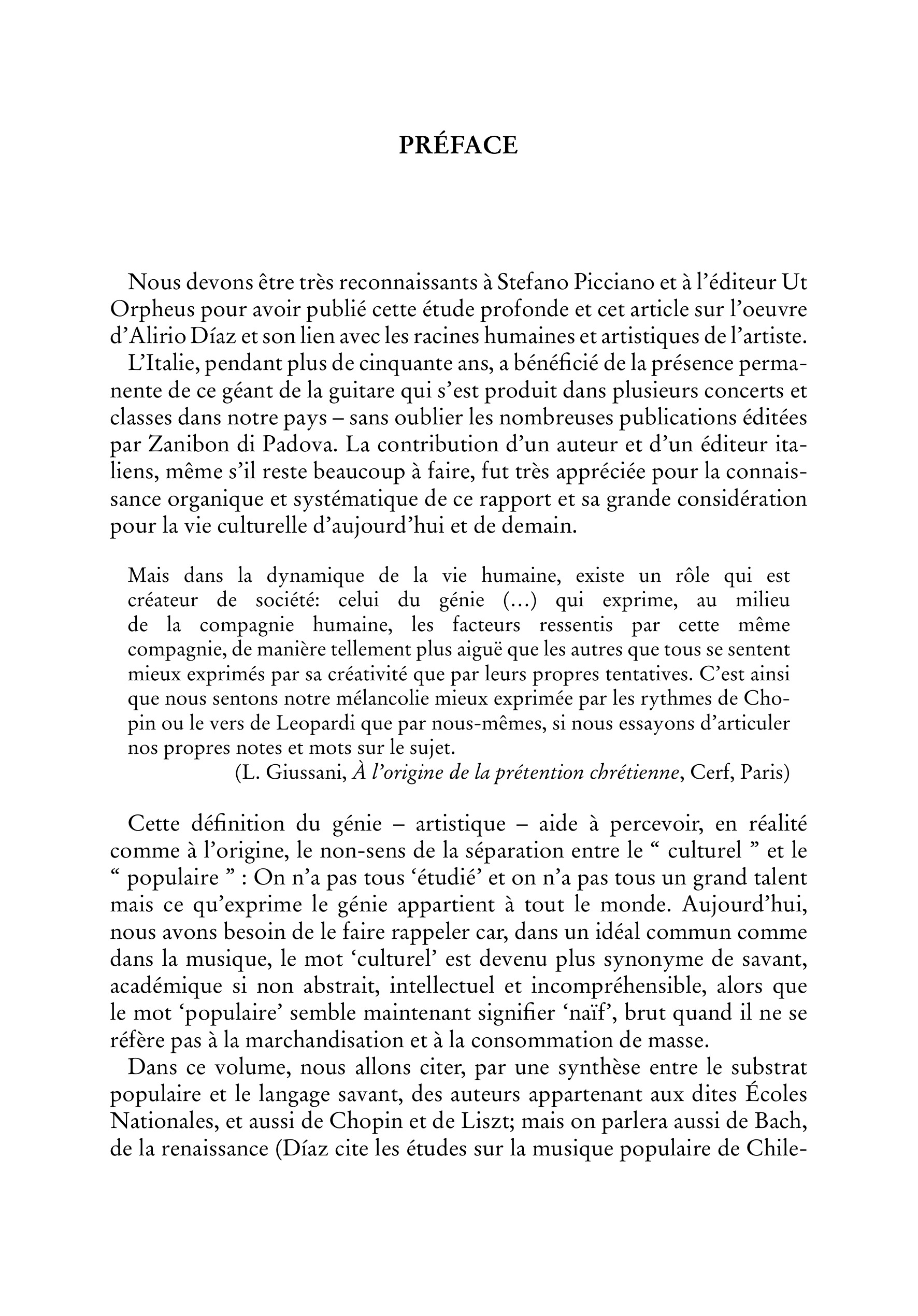 Ce livre nous renseigne sur le parcours d’Alirio Diaz, ce “ paysan qui jouait du cuatro ”, s’occupait des bêtes et entre-temps apprenait par cœur la Divine Comédie, qui par la suite est devenu un des plus célèbres virtuoses de la guitare, admiré par Celibidache et par Rodrigo, et qui a apporté dans ses interprétations la richesse de ce “ substrat ” qu’il évoque toujours avec reconnaissance. Son exemple démontre que même aujourd’hui le cultivé et le populaire sont – peuvent et doivent être – la même chose.