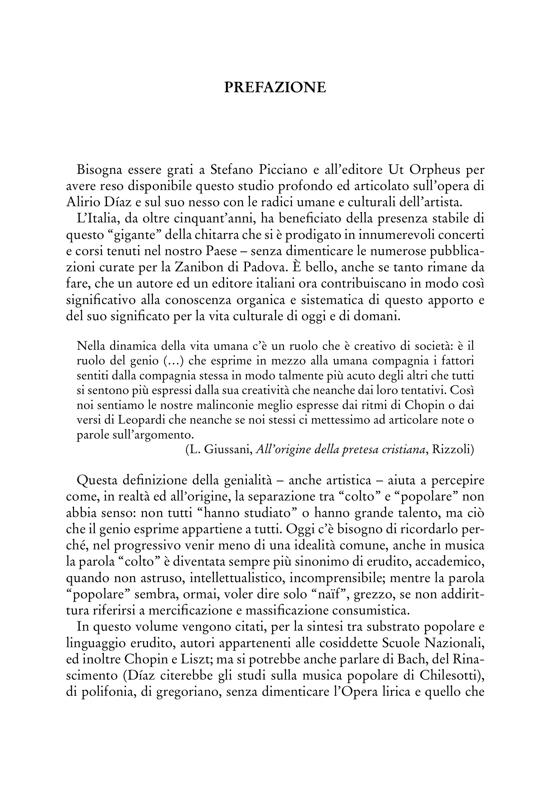 Questo libro ci illustra la traiettoria di Alirio Díaz, questo ‘contadino che suonava il cuatro’, accudiva le bestie e nel frattempo imparava a memoria la Divina Commedia, e che è poi diventato uno dei più celebrati virtuosi della chitarra, ammirato da Celibidache e da Rodrigo, e che ha portato dentro le sue interpretazioni la ricchezza di quel ‘sostrato’ da lui stesso sempre ricordato con gratitudine. Il suo esempio dimostra che anche oggi colto e popolare sono – possono e devono essere – la stessa cosa.