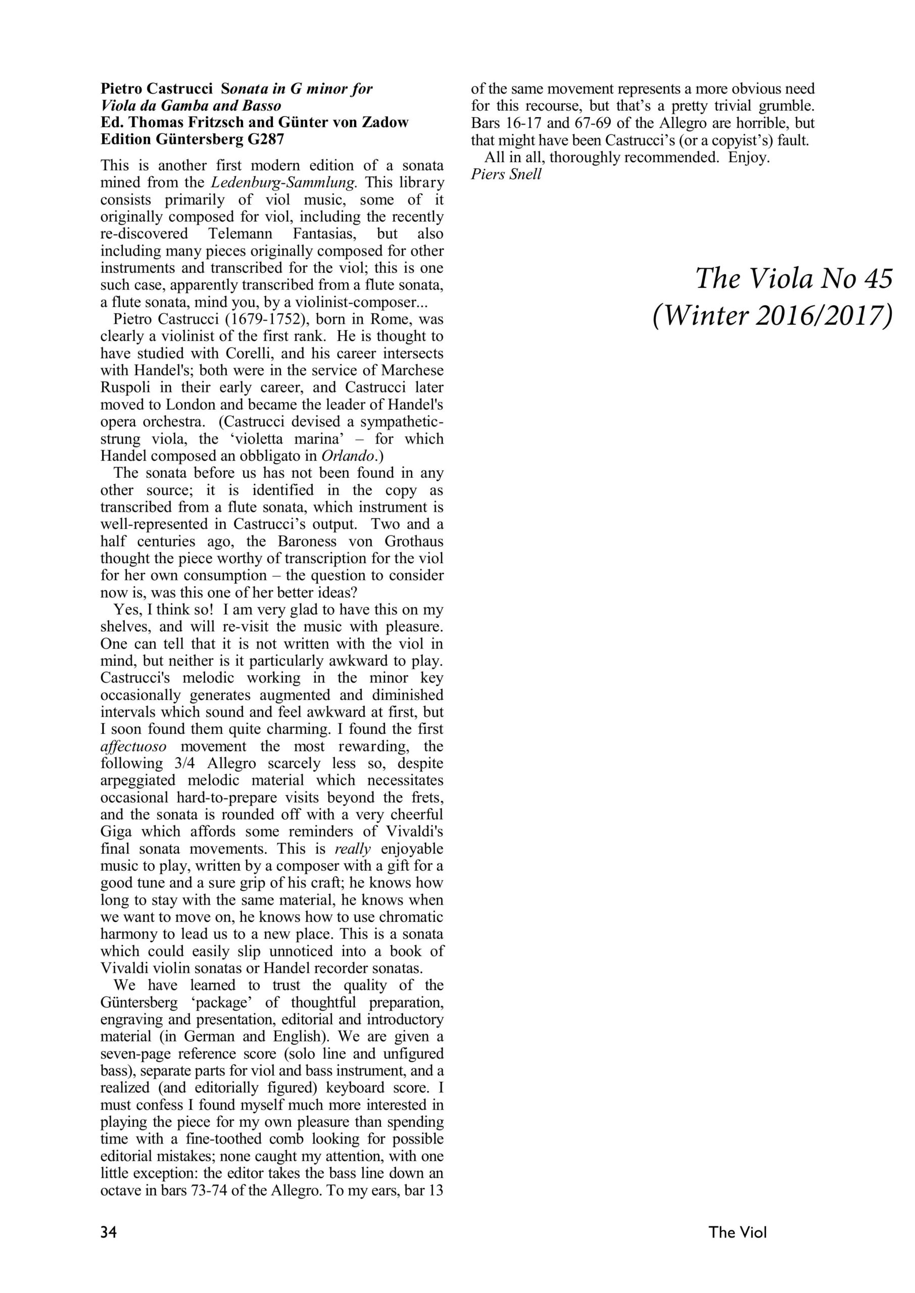 Pietro Castrucci (1670-1752) Sonata G-Moll für Viola da Gamba und Basso – Besprechungen / Reviews