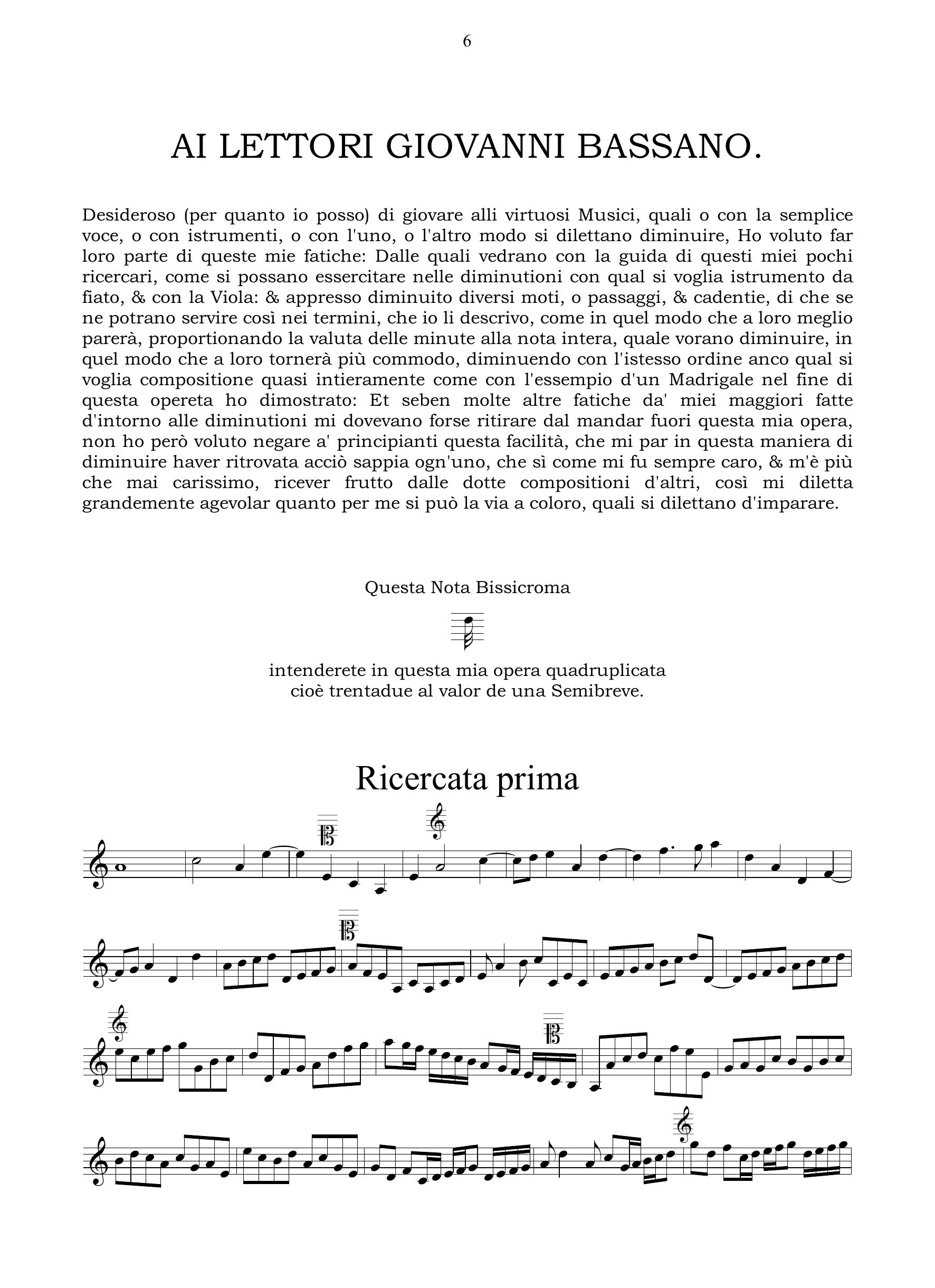 Breve introduzione (in italiano). 8 Ricercate per strumento soprano. Molti esempi di passaggi e cadenze diminuite. 2 Esempi di diminuzioni su “Signor mio caro” di Cipriano de Rore.