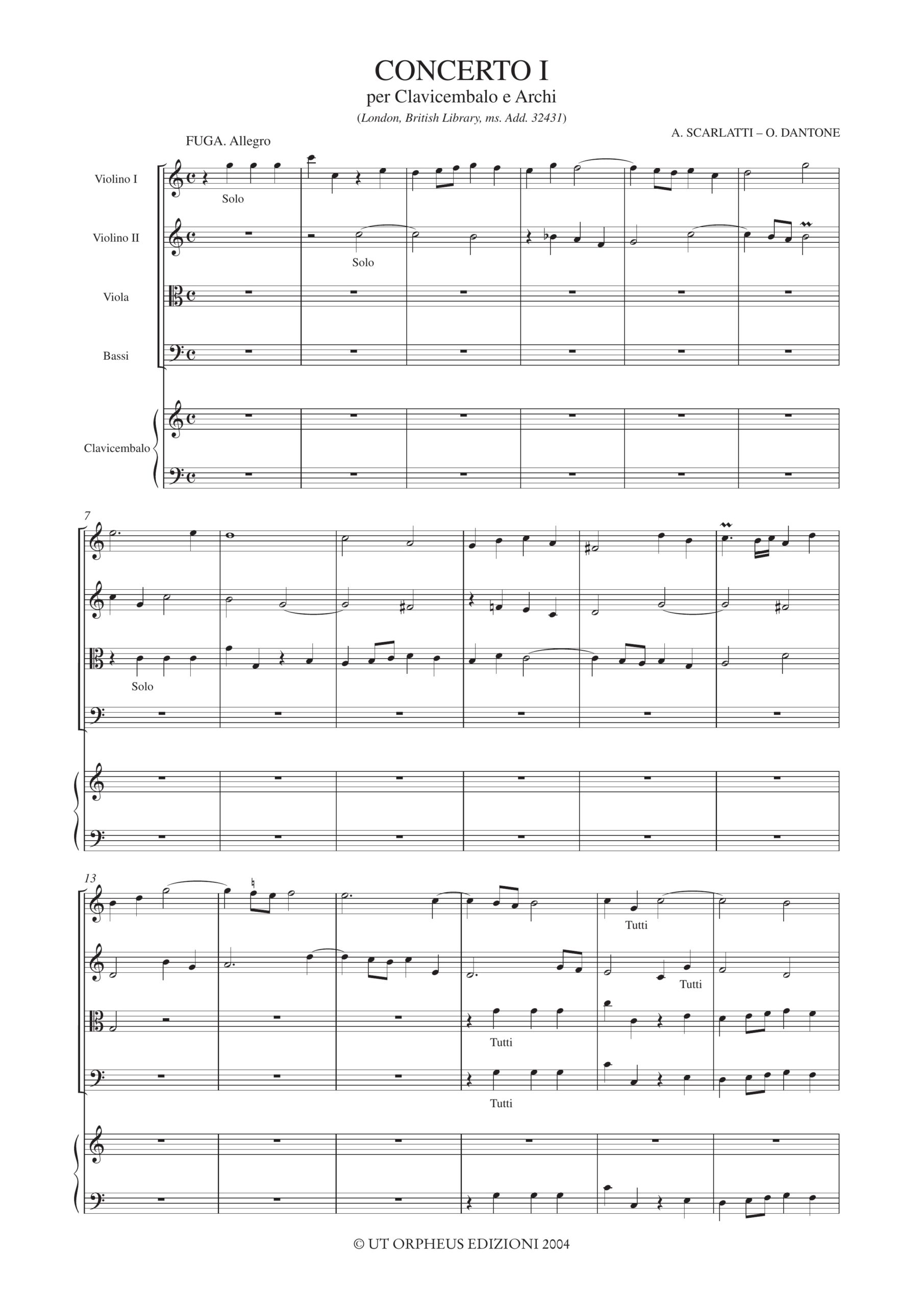 Scarlatti, Alessandro – Dantone, Ottavio: Concerto I (London, British Library, ms. Add. 32431) per Clavicembalo e Archi [Partitura]