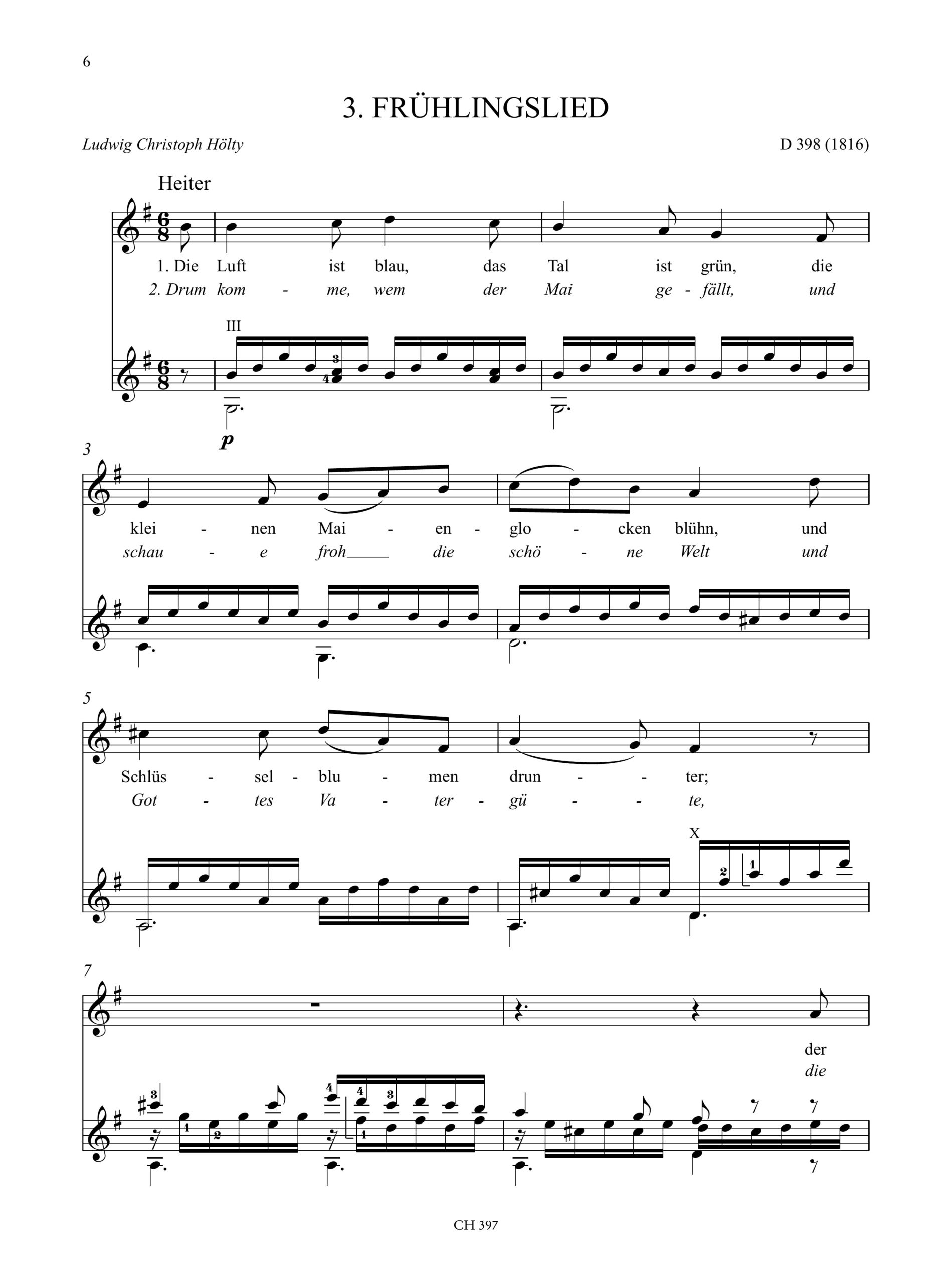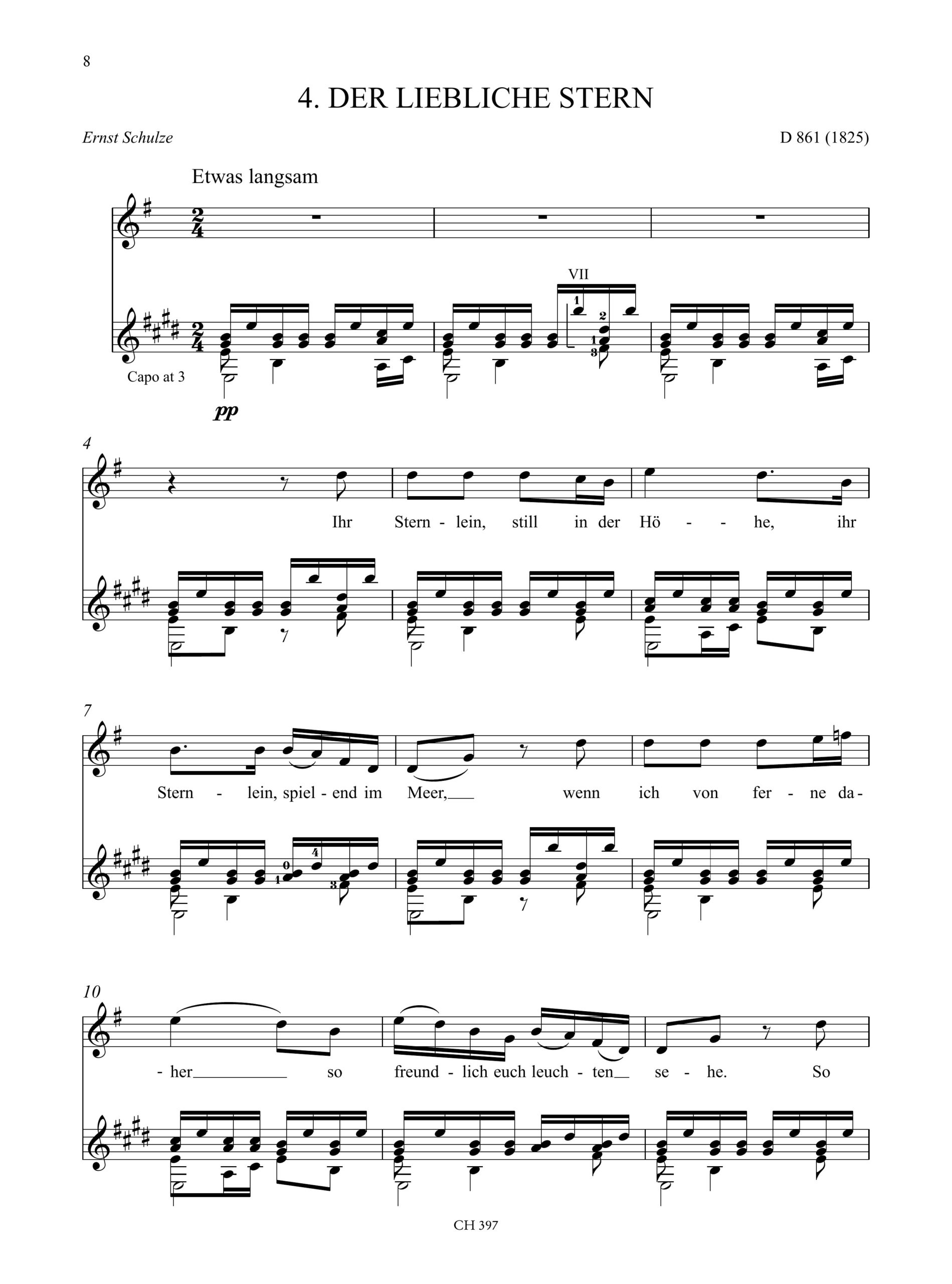 The songs in the present volume selected themselves for their vocal range and only one song, “Der Schatzgräber” D 256, had to be excluded. I am very grateful to Amanda Cook who took on the task of adding fingerings to most of these 55-year old arrangements. There is a small ossia part in “Freude der Kinderjahre”, a vocal ossia in “Tischlied” and also one or two places where chord progressions have been changed for easier performance. Transpositions from the original keys are noted in the musical text and dynamics have been inserted where they can be corroborated. I have refrained from including an English, or any other language, translation. Singers and guitarists will have their own resources and knowledge for translating the meaning of the texts into their own language, an essential tool for the interpretation of these wonderful songs.