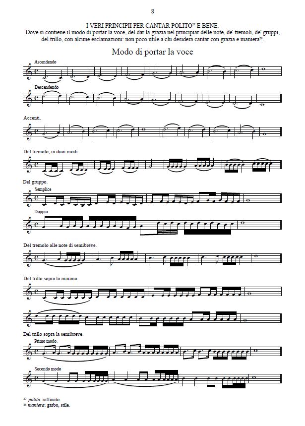 Spiegazioni sui diversi strumenti (viola da gamba, lira da gamba & da braccio, viola bastarda, strumenti ad arco, strumenti a fiato). Moltissimi esempi di passaggi, gruppi, trilli, accenti, tremoli, esclamazioni. Madrigali, mottetti e canzoni diminuiti. Esempi “per sonar alla bastarda”.