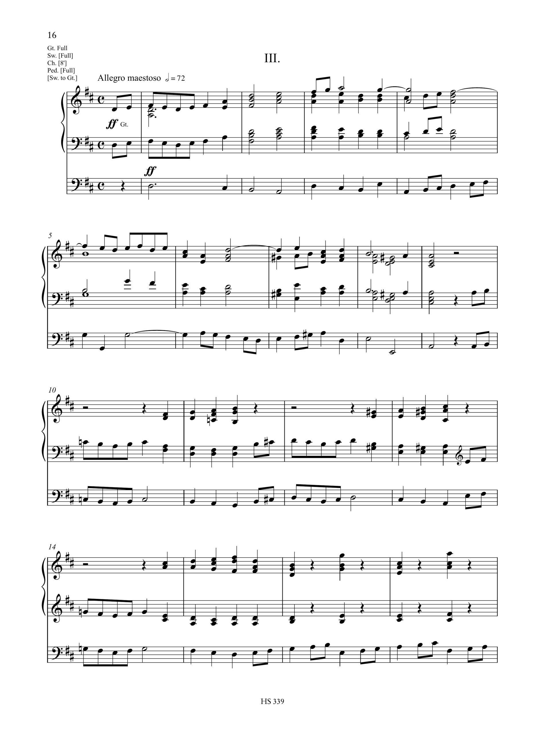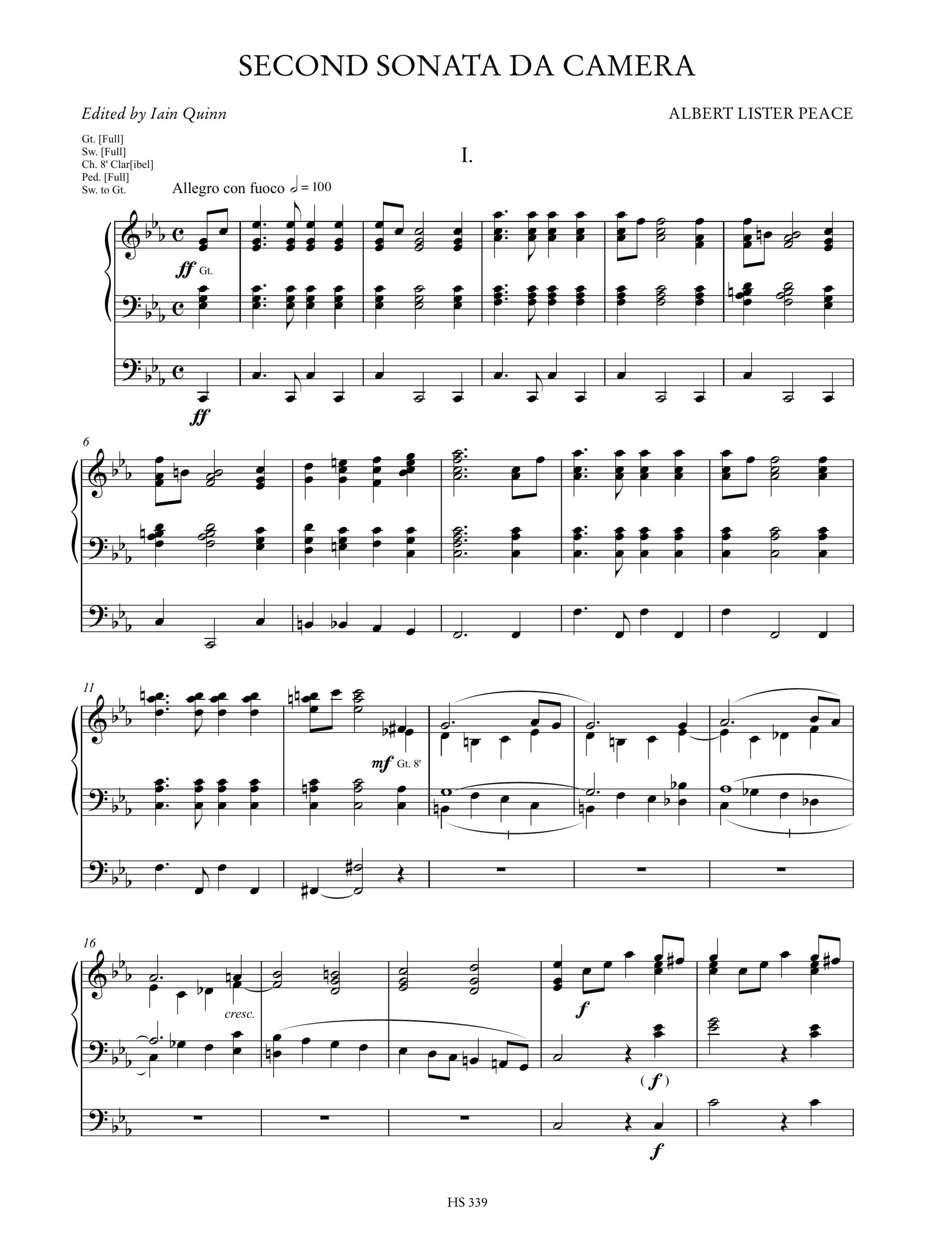 and written by a leading concert organist of the era, are notable additions to the repertoire in an era when organ concert programming was heavily dominated by transcriptions of orchestral and chamber repertoire. The sonatas are playable on both small and large instruments and allow for creativity in registration. The technical difficulty varies between movements but would have been consistently within the range of many organists of the era. Peace’s compositional style shows an easy engagement with chromaticism and confident musical gestures that would have stood apart from many earlier English sonatas that were still rooted in Mendelssohn’s harmonic language. As such, the da Camera element is also shown in a compositional approach that would have been familiar with larger English concert world. This is especially obvious in his approach to the conclusion of movements which are often noticeably declamatory in a manner that is not redolent of earlier sonatas.