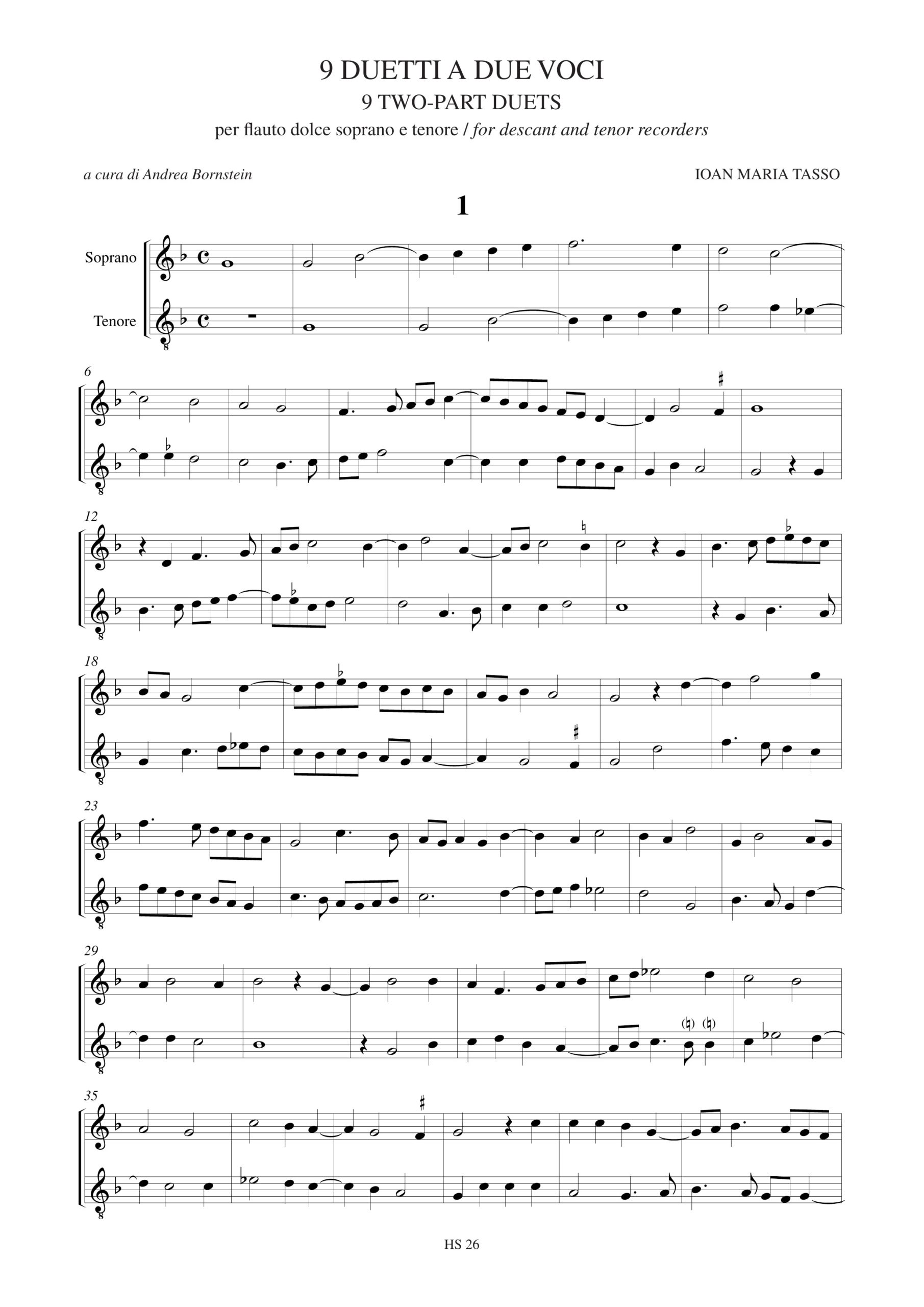 Tasso, Ioan Maria: 9 Duetti (Venezia 1559) per Flauto Dolce Soprano e Tenore