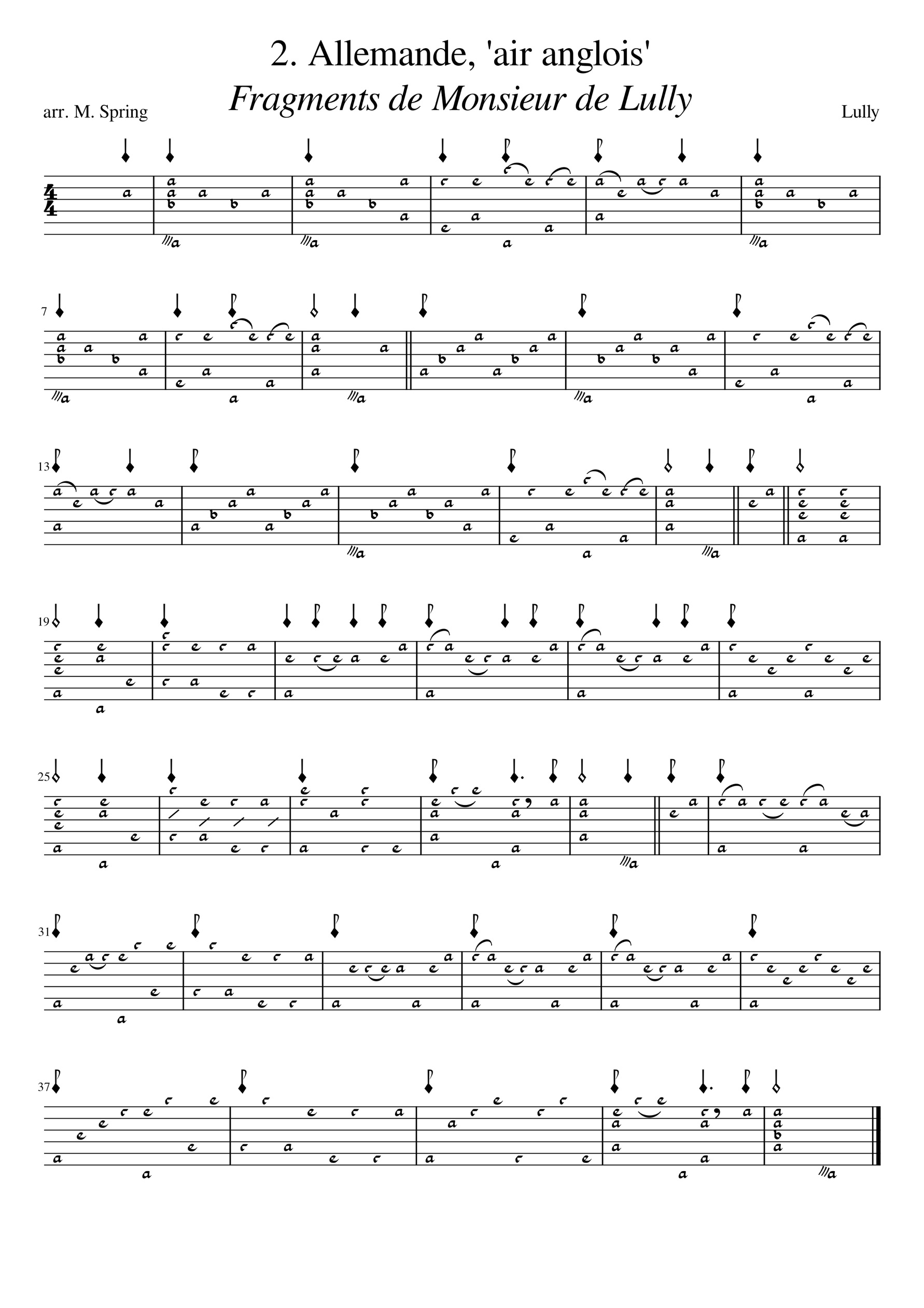 Terpsichore et Pan, French Orchestral ballet music, arranged for 11-course baroque lute. This is a selection of music from French court ballets and operas, by Lully or Campra, which had a second life as chamber music, with tunes used in the dance instruction books published at the beginning of the 18th century, where they were printed with detailed choreographies. Original intabulations attributed to Gallot in the Balcarres Lute Book are supplemented with may more by Matthew Spring. These have been serialised in recent issues of Lute News, and now appear in a single volume for the convenience of the player. 24 pieces for 11-course lute, 33 pages,