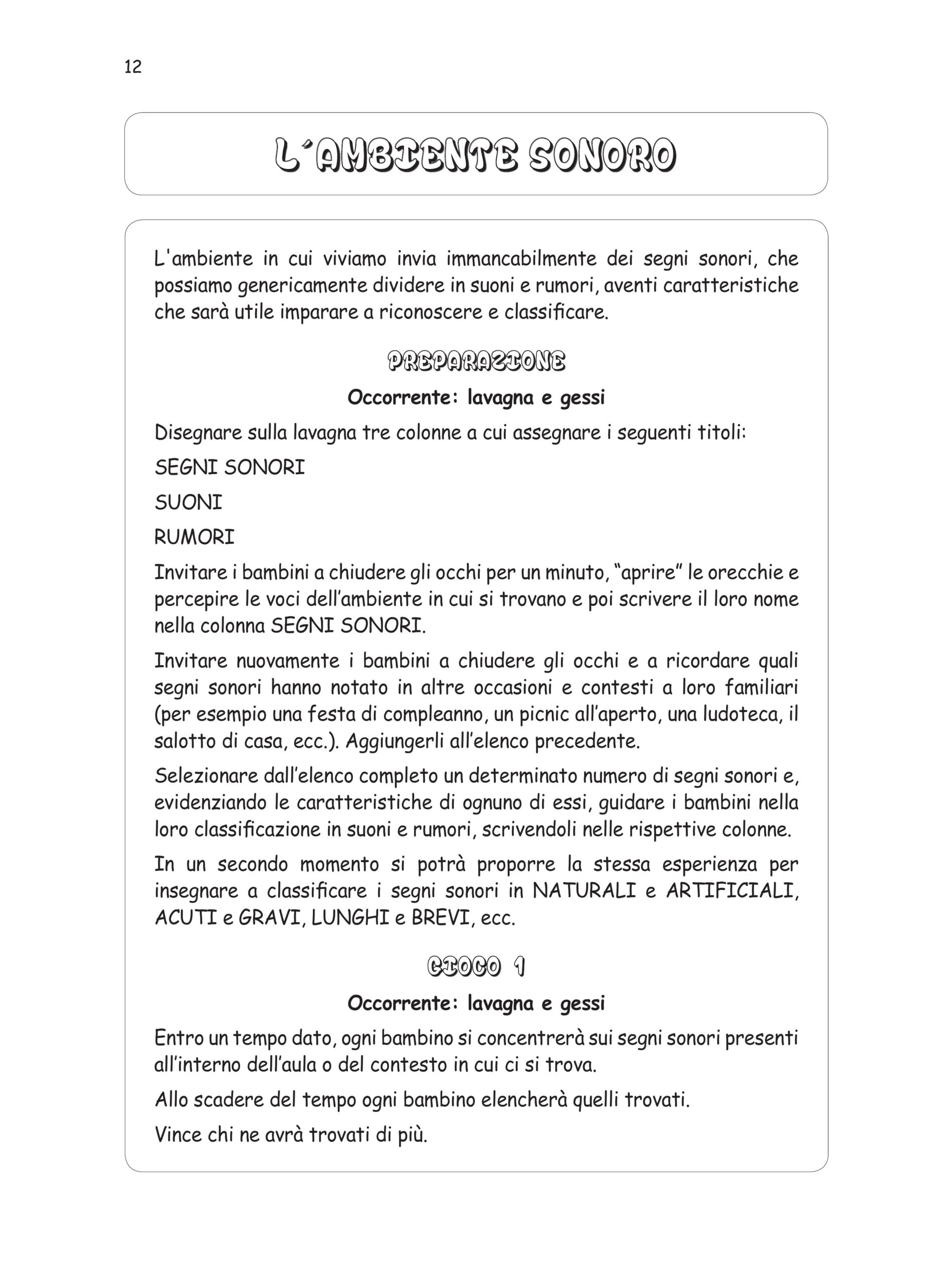 ad uso degli insegnanti, è stato ideato per coinvolgere i bambini in attività che mettano in gioco – è il caso di dirlo – il senso dell’udito e aiutino a sviluppare qualità utili non solo a fare musica ma anche a esprimersi e a comunicare armonicamente all’interno di un gruppo.