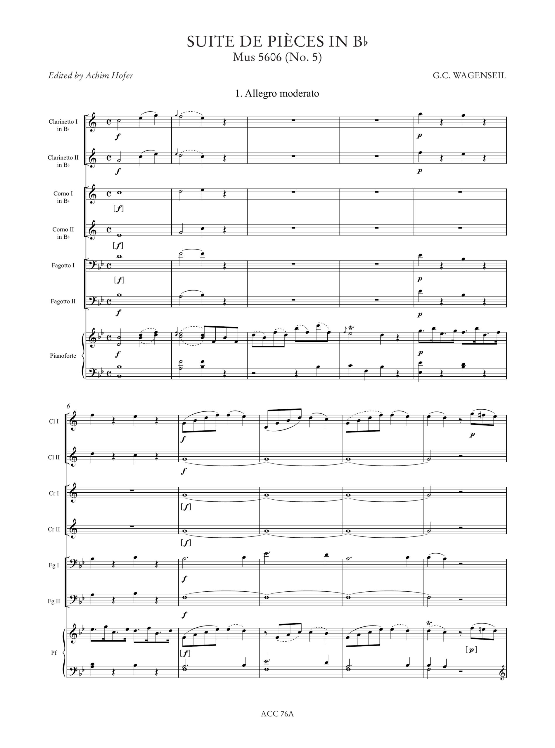 Wagenseil, Georg Christoph: Suites de Pièces (Schwerin Ms. Mus 5602-5606) per 2 Clarinetti, 2 Corni, 2 Fagotti e Pianoforte [Partitura]